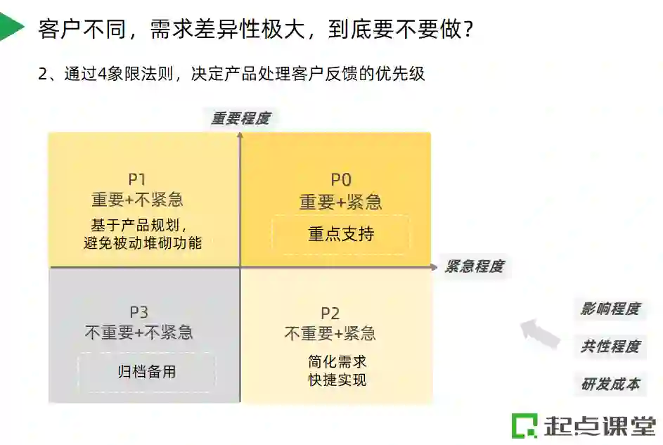这个部分,老师将会从产品价值、经营战略、产品战略等维度带大家梳理客户需求管理机制保证。并分享一套4象限法则让大家做好产品需求的评估。