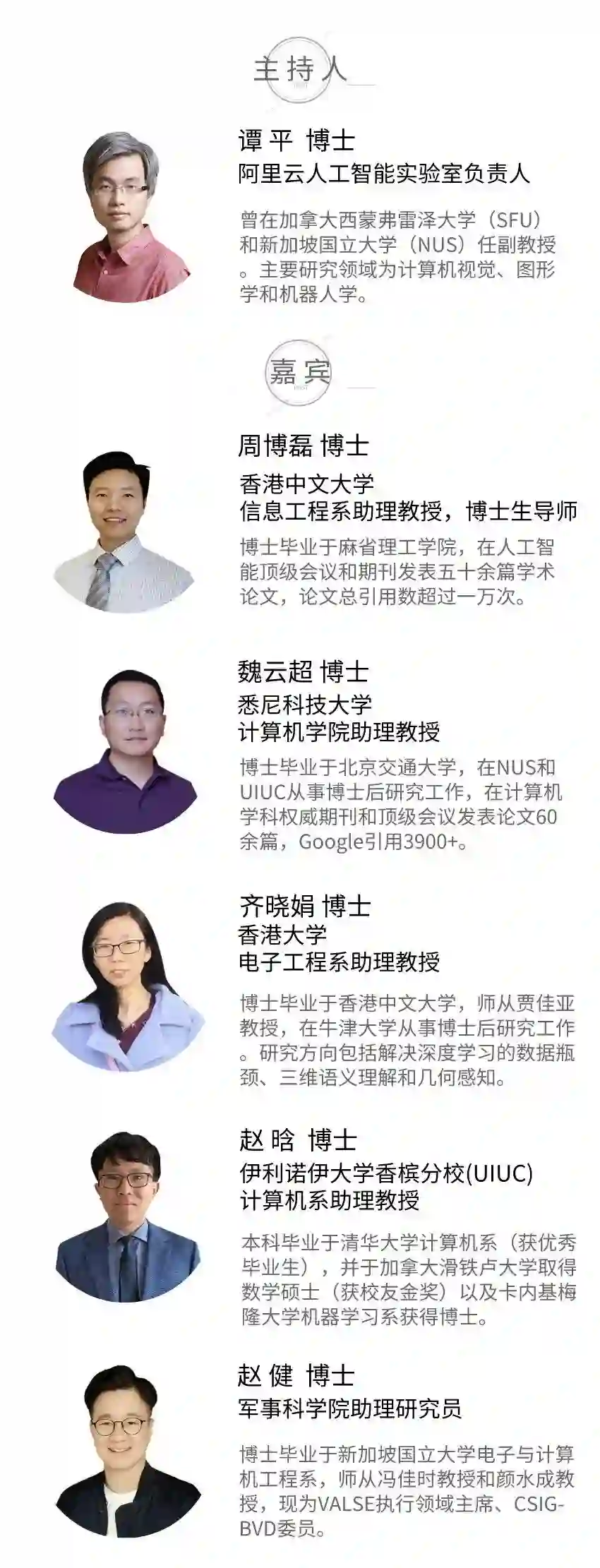今年的线上顶会活动,我们除了继续邀请人工智能领域的领航者、开拓者,更邀请到了一批年轻有活力的新鲜面孔。我们相信这些“后起之秀”将成为CV界的奔涌后浪,不断创造新的科研事业巅峰,将所学所成在工业界发光发热。