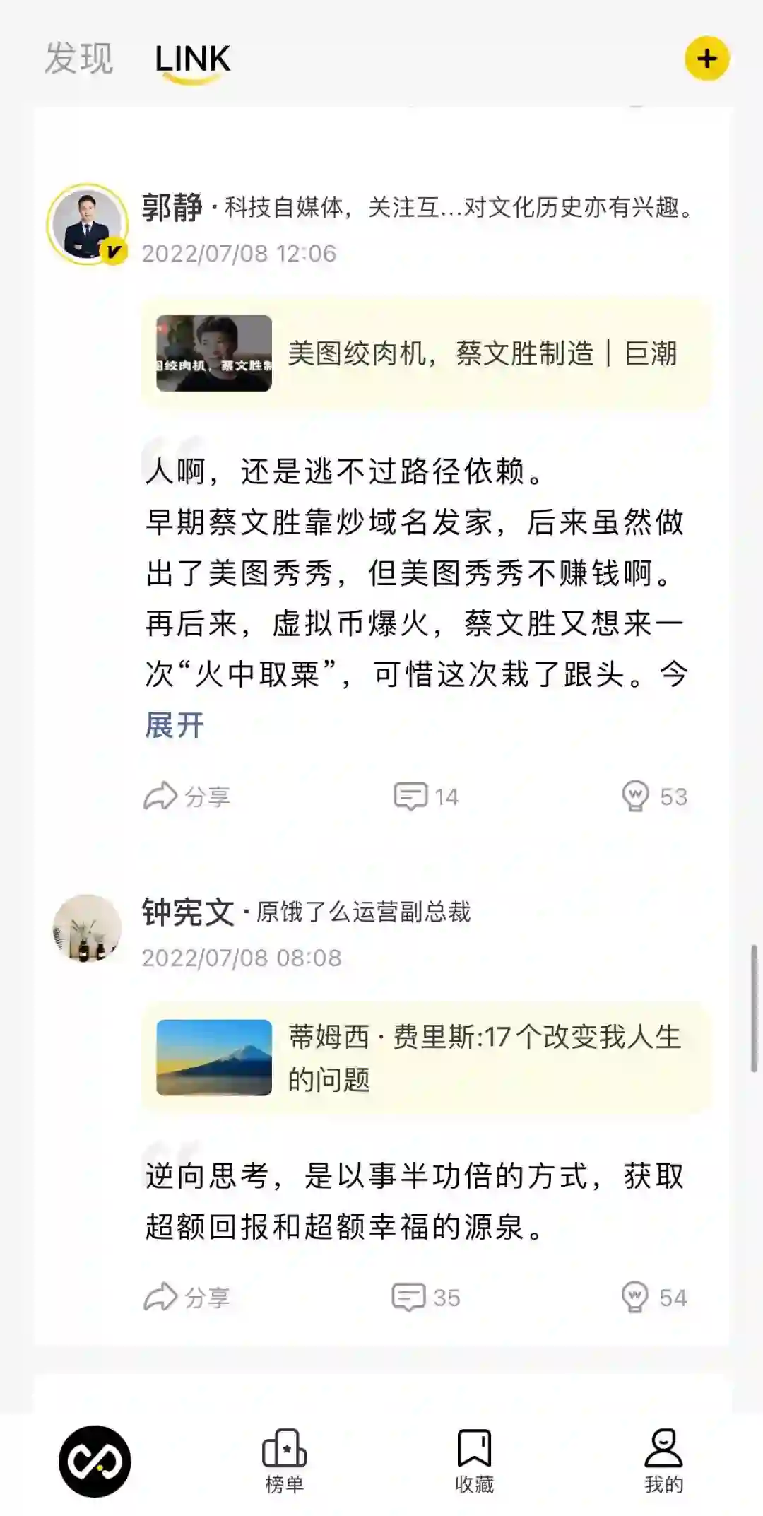 这一点也是翎氪想做的。翎氪取意于英文单词「Link - 连接」。相较侧重于内容生产和兴趣聚集的泛娱乐社区,翎氪更注重高质量内容的推荐与分享。“翎氪的核心是以人为维度进行内容分发,本质上是人本身在做判断。”