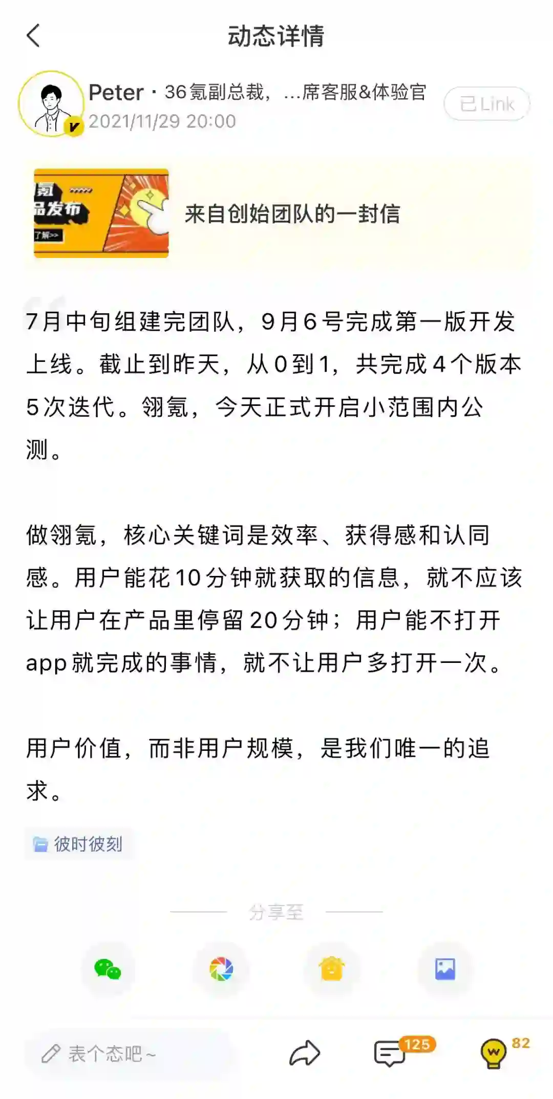 王坤在翎氪发布动态,阐述翎氪的产品理念
