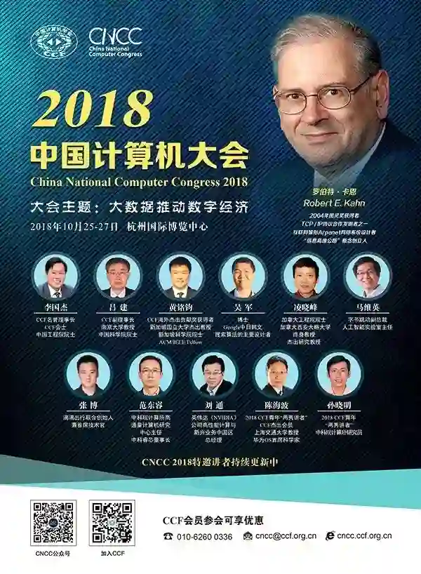 CNCC 2018 将邀请业界知名学者进行特邀报告演讲,届时 CCF 名誉理事、CCF 会士、中国工程院院士李国杰将围绕「大数据推动数字经济」这一话题对大数据发展现状和趋势及其对经济社会发展的影响展开演讲,同时对中国产业经济现状及未来发展给出合理化建议。另外2004年图灵奖获得者、TCP/IP 协议合作发明者、互联网雏形 Arpanet 网络系统设计者 Robert E. Kahn ,CCF 副理事长、南京大学教授、中国科学院院士吕建,新加坡国立大学杰出教授、新加坡科学院院士、ACM/IEEE Fellow 黄铭钧,Google 中日韩文搜索算法的主要设计者、博士吴军,加拿大工程院院士、加拿大西安大略大学终身教授凌晓峰,2018 CCF 青年「两秀讲者」陈海波、孙晓明等也将进行特邀报告演讲。