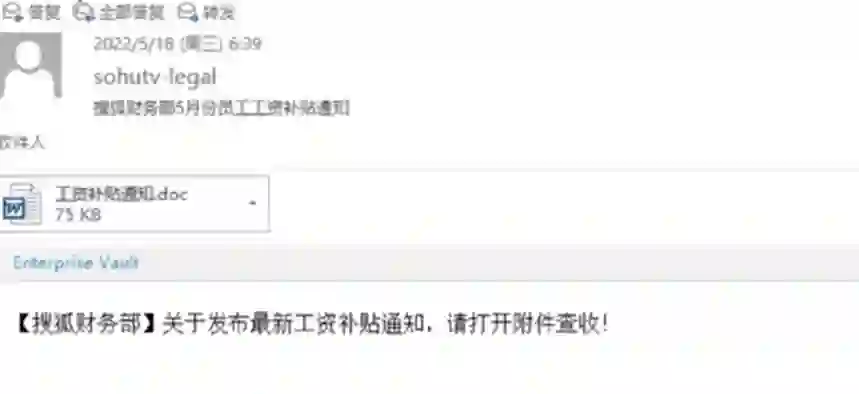 5月18日,搜狐公司全体员工收到了一份发信地址来自 sohutv-legal@sohu-inc.com 的邮件,这一地址来源于公司内部域名,邮件中注明“搜狐财务部“,内容是关于5月份的工资补贴通知。根据流传的聊天记录显示,许多员工按照附件要求完成扫码,填写银行账户信息等操作,最终导致工资卡内的余额被悉数划走。