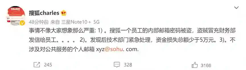 随后搜狐发布官方声明,但目前还没有已经追回损失钱财的消息。