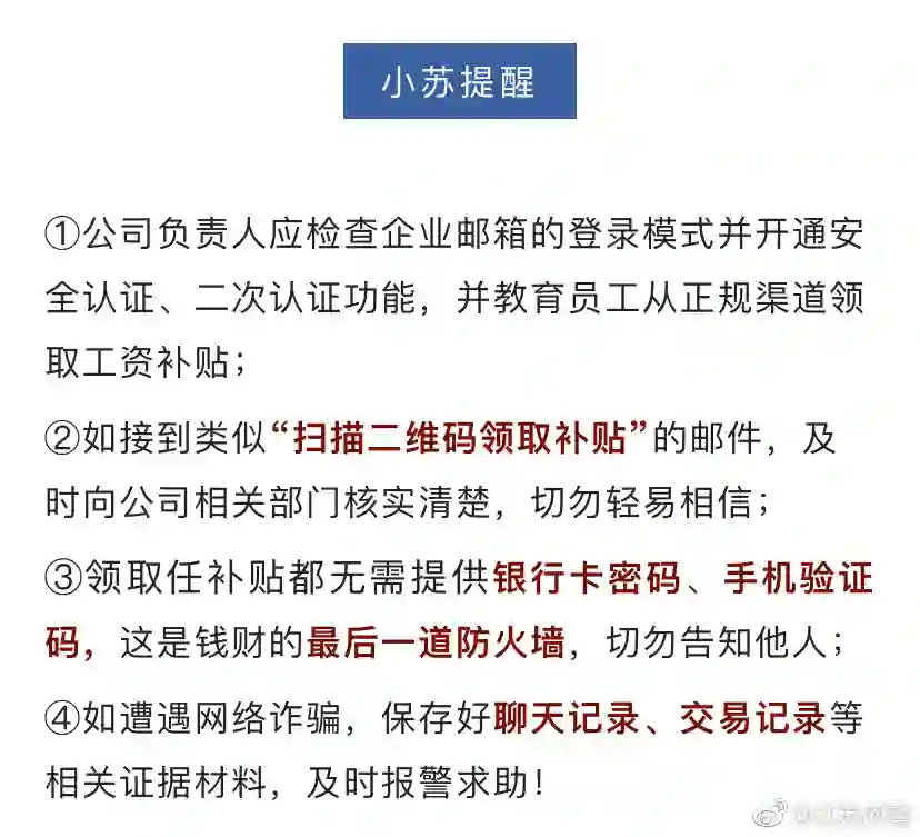 而消极一点也要提醒一下自己“不要把鸡蛋放在一个篮子里”,如果工资卡内就是自己的全部家当,那麻烦就不止是公司发布里的“不到四万块钱”那么简单了。总而言之,遇到这种诈骗邮件,Copy 江苏网警的一段话就是:
