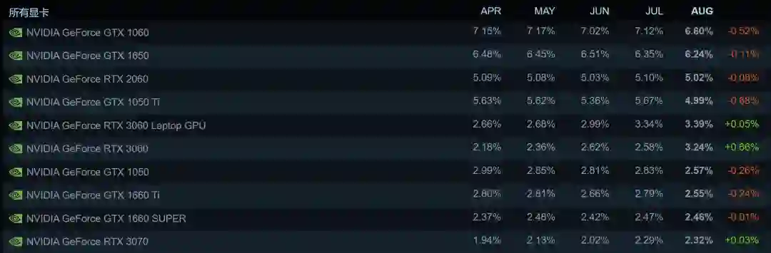 前十名中,只有一款3070位居末席,其余全部是XX60以下级别的显卡。