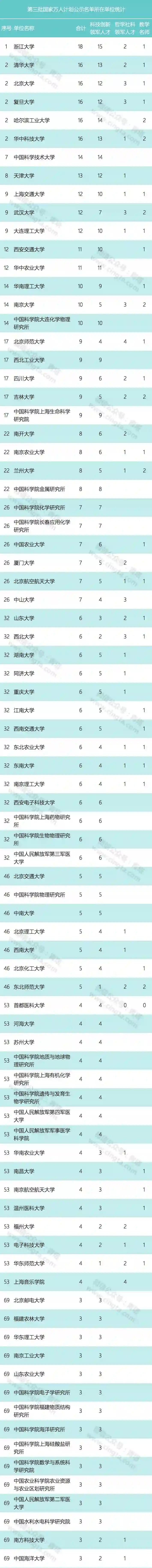 第三批国家万人计划领军人才人选单位统计和具体名单如下(统计结果不含科技创业领军人才,各高校附属医院、研究生院纳入高校进行统计):