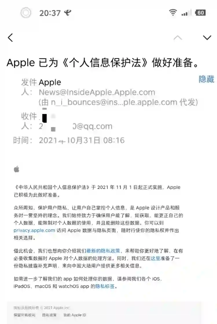 2021年10月31日,苹果公司给国内开发者发送邮件,说明苹果已积极为我国11月1日实施的《个人信息保护法》做好准备。