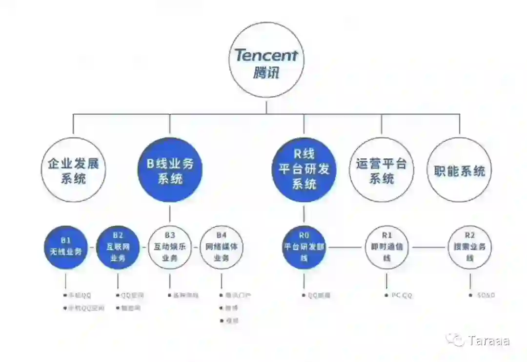根据极客公园的文章,这是腾讯 2005 年组织架构调整后的图。