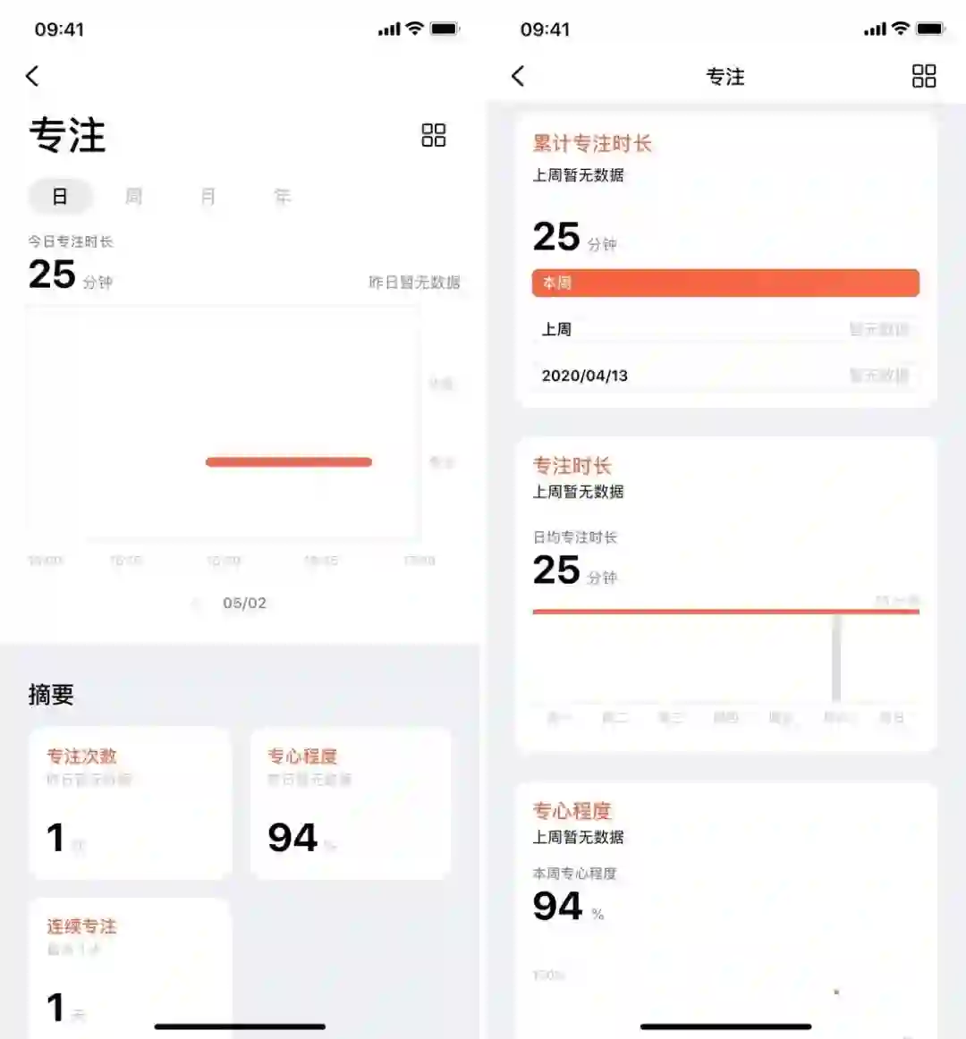 潮汐支持与系统「健康」应用同步数据,当然,你也可以直接在潮汐里查看自己的使用数据。应用会根据你记录的专注次数、连续次数来生成图表。此外,应用还会通过手机传感器来检测你拿起手机的次数,从而判断你的专心程度。