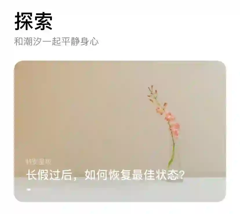 除了在资源库中寻找练习以外,潮汐的「探索」页还有一些合乎时宜的文章或练习推荐。比如在五一长假后恢复状态的方法、面对疫情如何消除紧张情绪等。