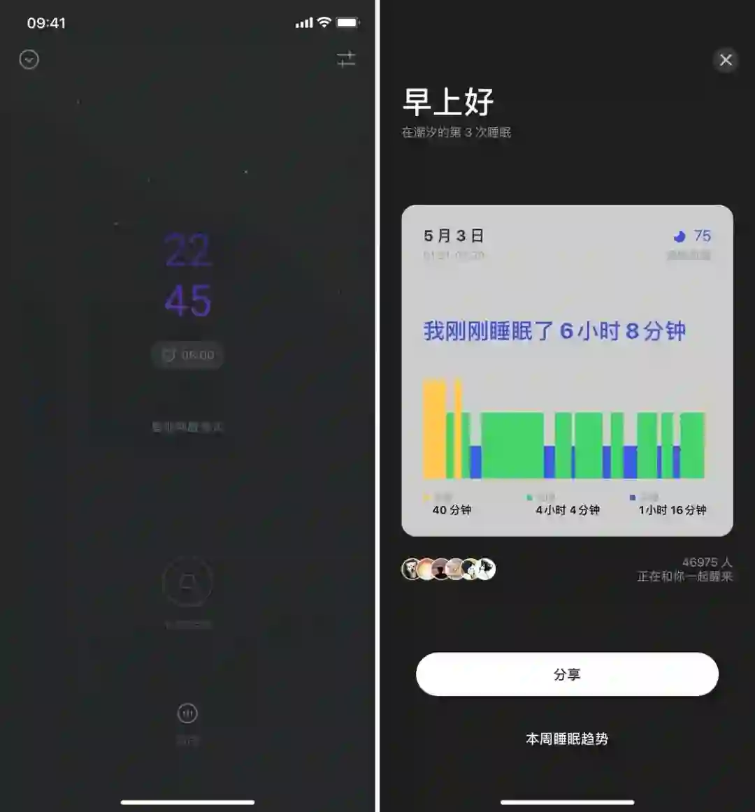 如果你在深度睡眠阶段被强制唤醒,那种感觉是相当糟糕的。因此,你需要借助应用来将闹钟设定在浅度睡眠周期内。潮汐的「轻唤醒」功能就以此为基础,应用会在你设定的起床时间前 20-30 分钟内,通过手机传感器检测你的睡眠状况,并在你处于浅度睡眠时将你唤醒。