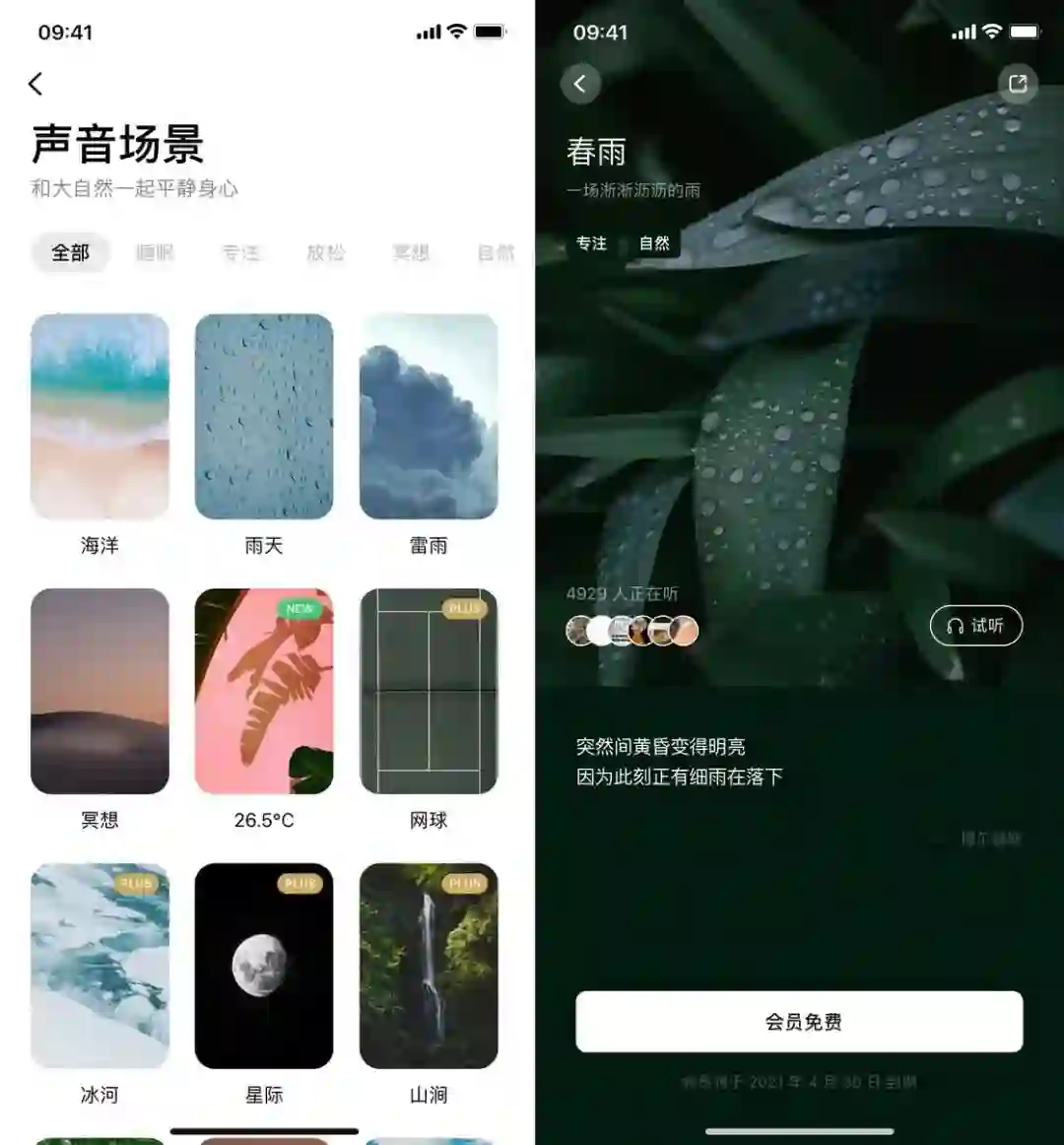 如果你想解锁更多声音,还可以选择订阅「声音卡」或 Plus 会员,两者主要的差别在于「声音卡」只可以解锁白噪音里的会员素材,而 Plus 会员还能解锁冥想练习、轻唤醒铃声等更多内容。