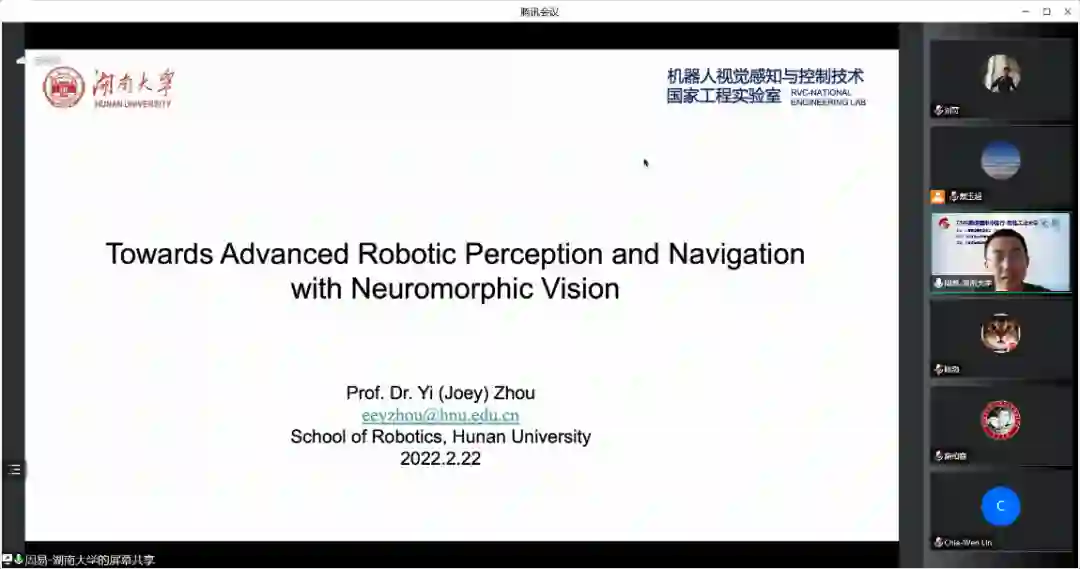 来自湖南大学的周易教授带来了题为“Towards Advanced Perception and Navigation with Neuromorphic Vision Sensors”的报告。报告指出了事件相机用于高速和高动态范围成像环境下的机器人视觉导航的优点,介绍了事件相机的主要应用场景,并详细讲述了基于事件信息的感知和导航的相关工作,包括基于事件相机的三维感知、动态场景理解和SLAM等方面。