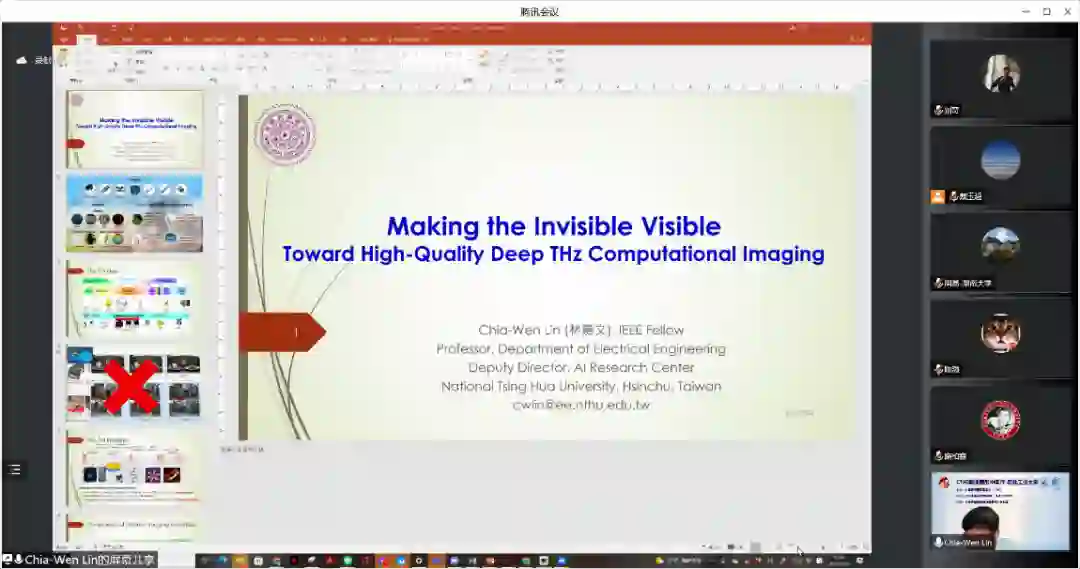 来自国立清华大学的林嘉文教授进行了题为“Making the Invisible Visible: Toward High-Quality Deep THz Computational Imaging”的报告,讲述了太赫兹成像的应用背景,详细探讨了如何利用太赫兹的强度和相位图像的互补信息来突破太赫兹成像的限制,介绍了一种新的物理方法引导的深度神经网络模型来实现有效的实现太赫兹图像复原,展示了搭建的实验装置和数据库,取得了较好的实验结果。
