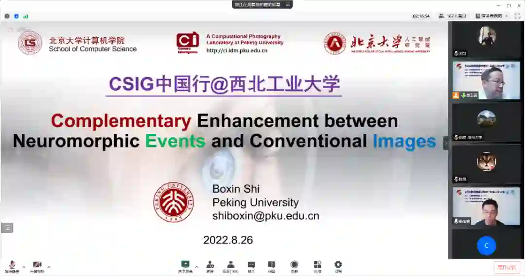 来自北京大学的施柏鑫研究员带来了题为“神经形态事件与传统图像的互补增强机制”的报告。报告主要涉及事件相机与传统相机融合并互补增强成像质量的计算摄像方法与系统,一方面介绍了传统图像如何增强事件信号的质量,对其进行去噪、超分辨率操作并建立其与传统图像的关键点匹配,另一方面,介绍事件信号如何引导传统图像的超分辨率、去模糊以及应用于卷帘快门果冻效应的消除。