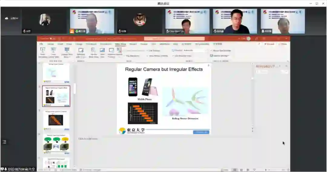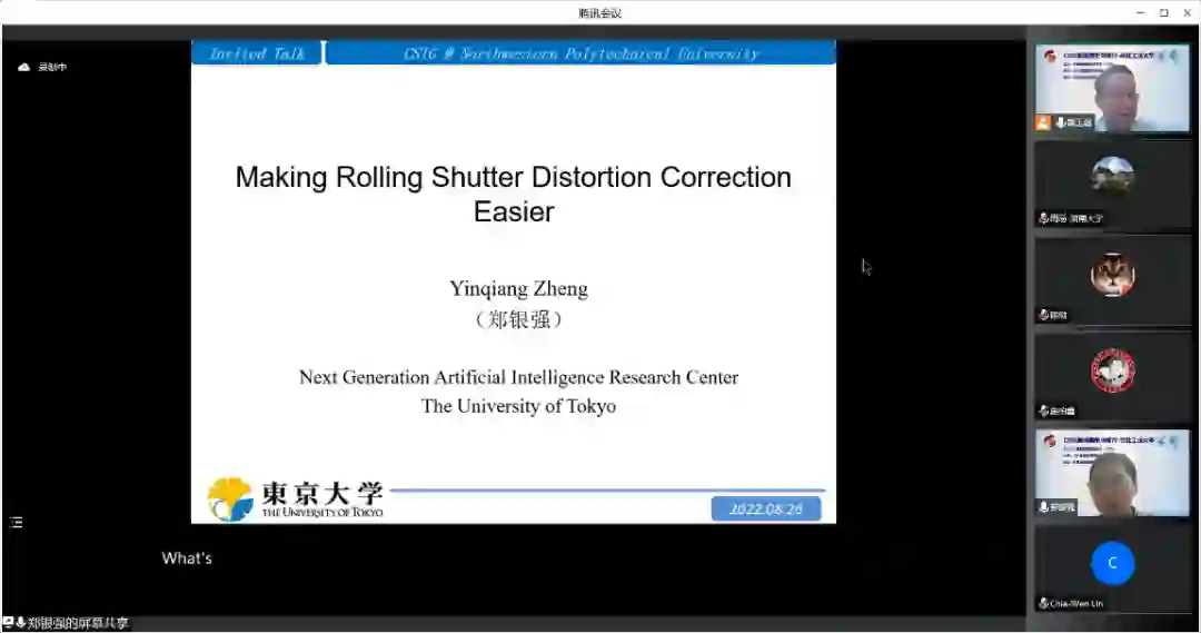来自日本东京大学的郑银强教授带来的报告题目为“Making Rolling Shutter Distortion Correction Easier”。报告介绍了常见的消费数字相机在对快速运动物体拍摄时产生的卷帘失真效应,并指出了现有方法在处理卷帘失真方面面临的效率和泛化性方面的问题,提出了新的解决思路,详细讲解了利用全局重置特征将失真校正转化为去模糊问题,并利用双向卷帘同时进行失真校正和插帧的方法。