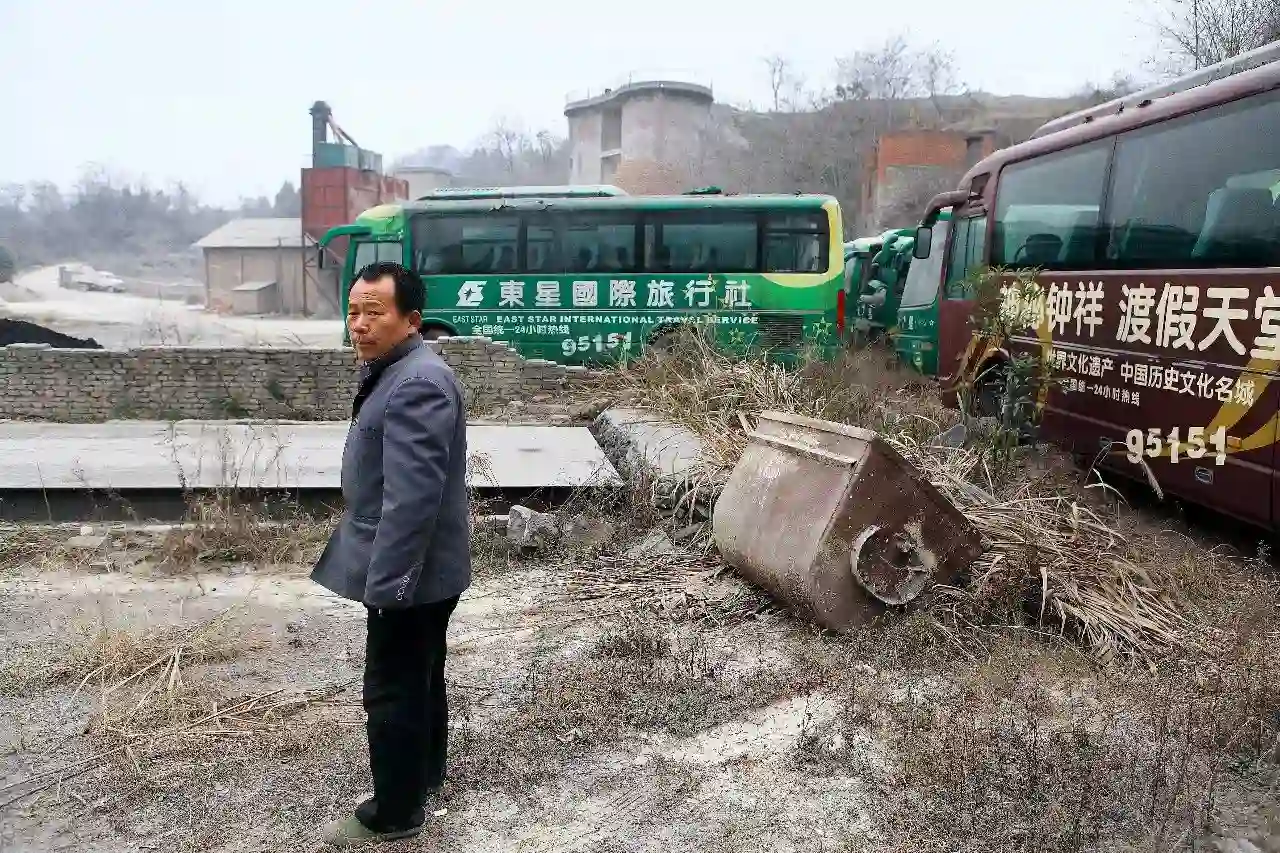 兰世立的大哥兰宏旺,身后是被法院查封的东星旅游车