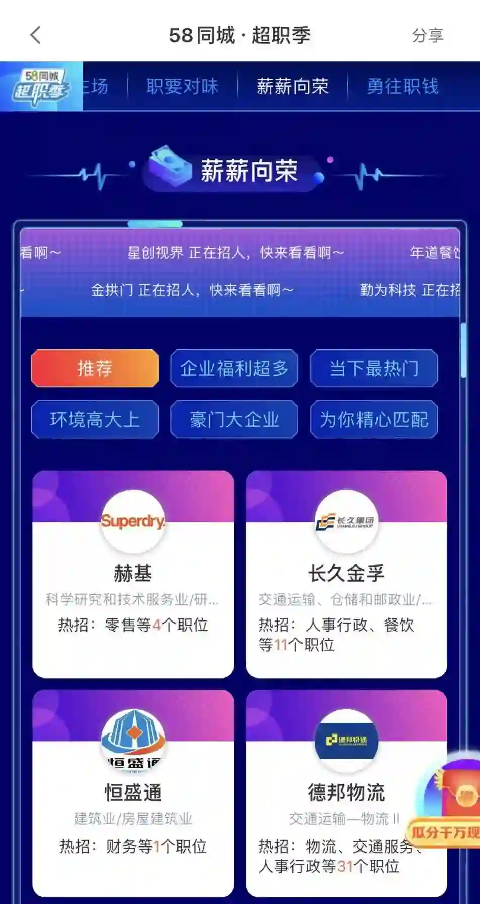 一、超职季的海量名企和年轻求职者的参与主体,真正精准定位了招聘市场供需需求。今年,58同城联合盒马、小米、联合利华、龙湖集团旗下龙湖智慧服务、龙湖冠寓四大超级雇主,携手300万家名企提供超过2000万个名优岗位,为海量求职者提供更便捷、高质量的就业机会。
