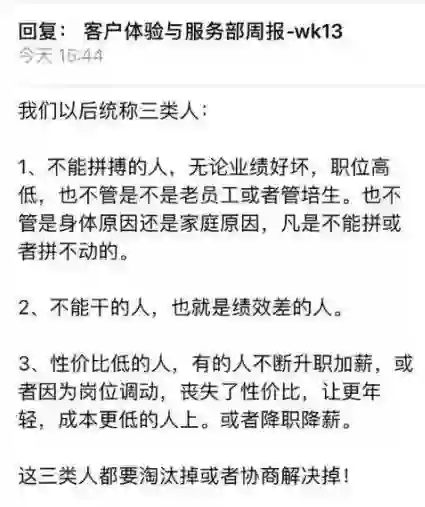 和今年腾讯“寻找年轻人”略带情怀的裁撤中干不同,京东三类员工中“性价比低”的标签,赤裸裸把人商品化的形容,显然让人无法接受的。