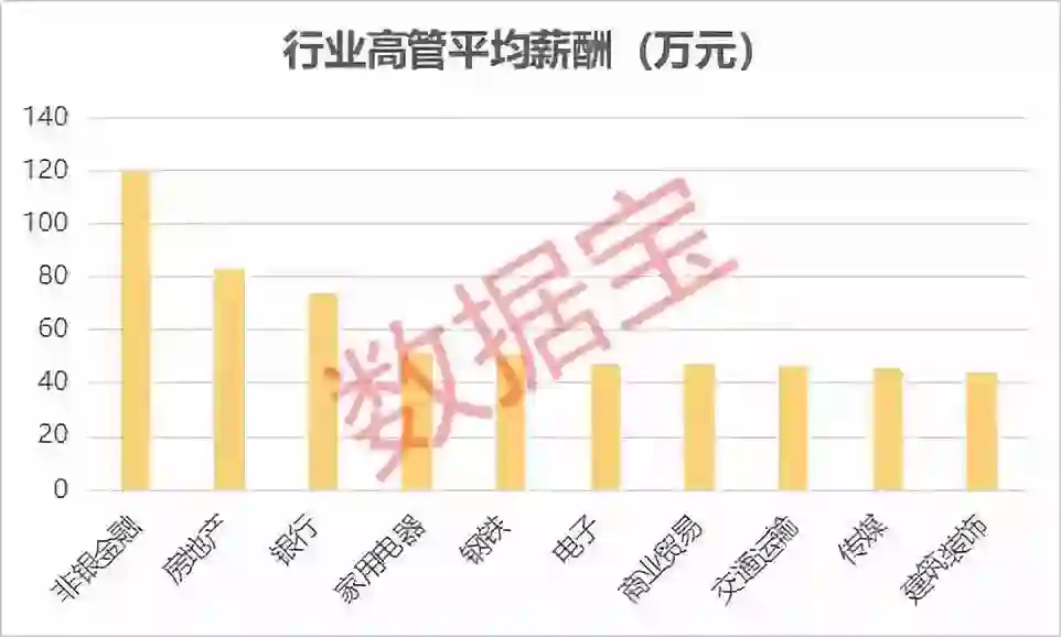 按照证券之星2018年4月的报道,2017年非银金融、房地产、银行三行业高管平均薪酬位列前三名,分别为119.93万元、82.93万元和74.35万元。而即便是排在倒数两名的采掘和机械设备行业,其高管的平均薪酬也超过40万。