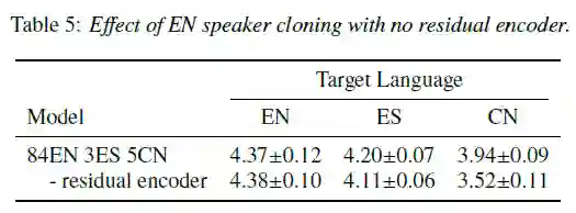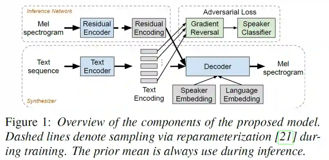 论文主要基于 tacotron2 框架实现,为了更好的建模 TTS 中文本到语音一对多的问题,论文还加入了 residual encoder。另外,前文中的跨语言中间表示特征基本是通过共享中间网络参数实现的,并没有显式去除 language-dependent 的信息,论文除了在 tacotron2 的 decoder 部分加入 [5] 和 [6] 中使用的 language embedding,结合了对抗式训练方法引入了梯度反传层(GRL)来去除 text encoder 输出特征中 language-dependent 的信息。