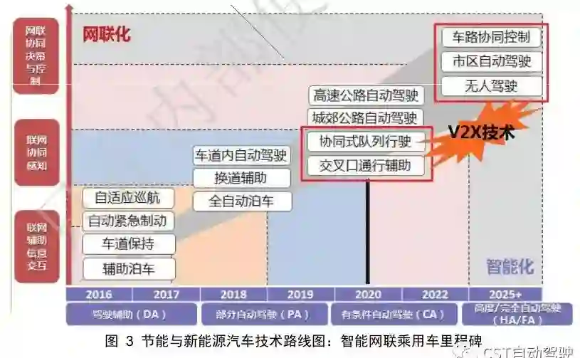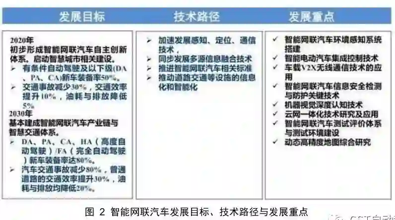 (2)中期重点形成网联式环境感知能力,实现可在复杂工况下的半自动驾驶(即有条件驾驶CA级);