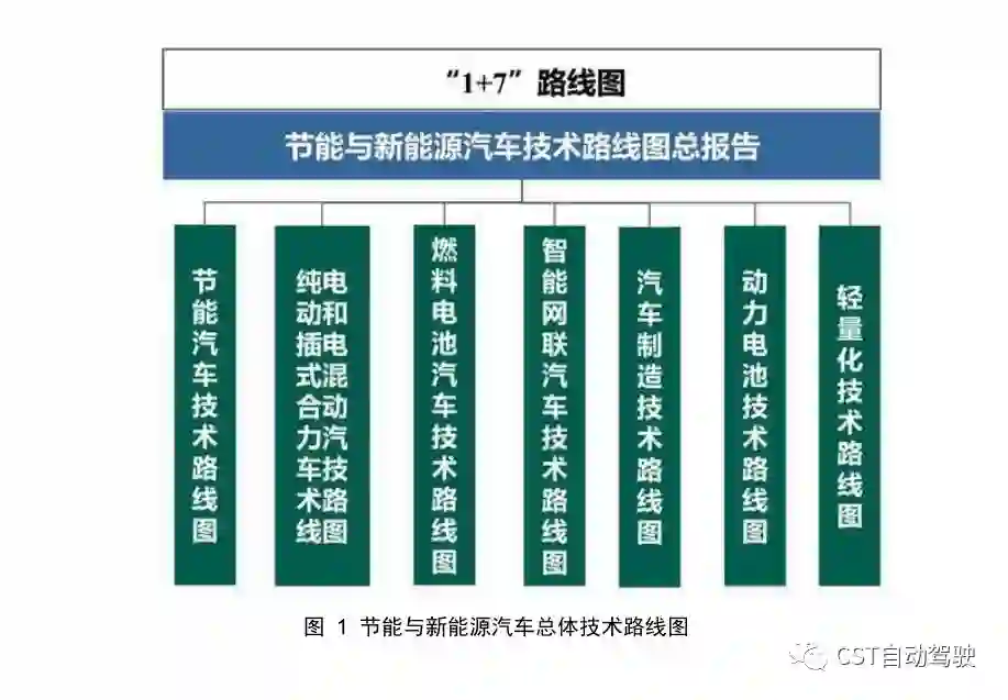 我国于2016年10月颁布《节能与新能源汽车技术路线图》。该路线图的总体框架为“1+7”,即一个总报告再加7个报告分会,分别是节能汽车、纯电动和混合动力汽车、燃料电池汽车、智能网联汽车和汽车制造、动力电池、轻量化的技术路线图,如下图所示。