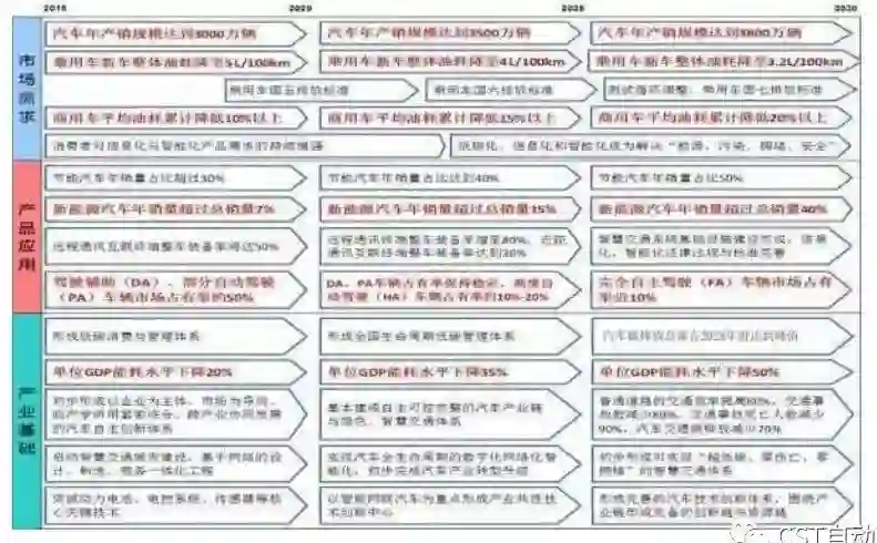 2030年:DA、PA、HA、CA、FA新车装备率达80%,汽车交通事故减少80%,普通道路的交通效率提升30%,油耗与排放均降低20%。