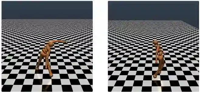 图 1 :经过遗传算法 (左) 和进化策略 (右) 训练的模拟机器人的行走情况。