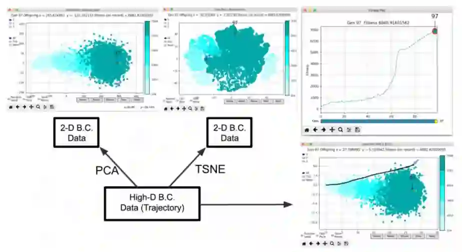 该工具还支持默认功能之外的高级选项和自定义可视化。例如,BC 不仅可以表示单个最终 { x,y } 点,还可以表示每个智能体的完整轨迹 (例如 1000 个时间步的串联 { x,y } )。在这种情况下,如果 BC 的维数大于 2,则需要使用降维技术 (例如 PCA 或 t - SNE ) 将 BC 数据的维数降到 2D。该工具可以自动执行这些步骤。