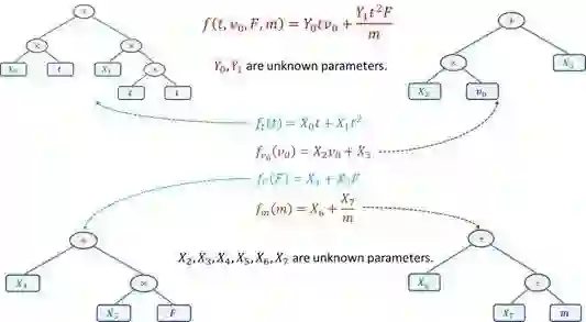 其中,X0和X1是两个未知的数值参数。类似的,对于v0、F和m,我们也可以得到对应的三个表达式模板。这个时候,我们就有了如下图所示的4个表达式模板。然后,利用表达式树对齐和模式匹配,我们就可以把这4个不同的表达式模板合并成如图中红色表达式所示的表达式模板。现在,我们有一个表达式模板和两个未知的数值参数Y0和Y1,同时有很多数据可以用来求解这两个未知参数。我们这时可以非常容易地计算得到我们想要的牛顿力学公式。