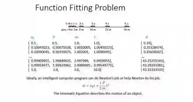 理想情况下,一个智能的计算机程序可以像牛顿一样经过数据分析直接得到如下的数学公式: