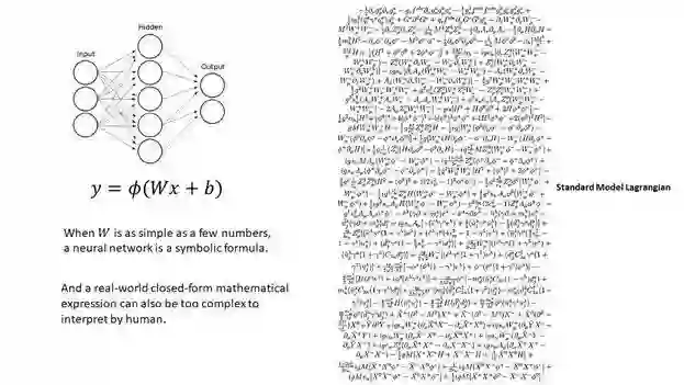 上图的左边是一个深度神经网络模型,非常简单;右边是一个真实存在的物理公式。我们很难说右边的公式比左边的神经网络模型更容易理解和解释。对于一个神经网络来说,当它的模型简单到只有几个节点的时候,其实就是一个简洁的数学公式,人们甚至可以搞清楚每一维度所代表的含义。而右边这样一个数学表达式,对于我们普通人来说,是非常难理解和解释的。