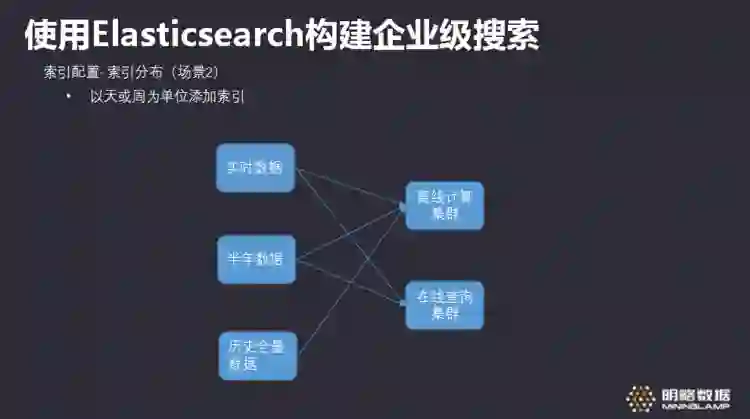 第二个例子是,对于数据规模不稳定且随时间增长的场景,可以以一天或一周为单位创建索引(根据具体需求而定),而且往往可以把实时 / 在线的数据索引存放在在线查询集群里,而历史的全量数据进行存放在离线计算集群,一般来说在线查询集群保留半年或一年内的数据,并可以使用更高端的配置(如 SSD)进行加速。