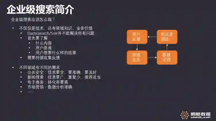 在设计一个企业级搜索方案时,首先要了解清楚,我们要处理的数据内容是什么样的,用户是谁以及他们想要什么样的输出结果;在设计完方案后,需要持续收集来自用户的反馈,修正我们对领域业务的理解、调整数据架构、进一步改进搜索的相关度效果,从而形成一个良性的闭环。