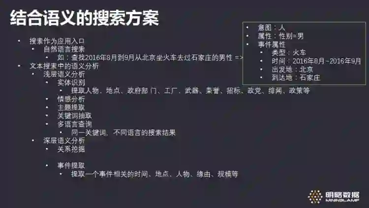 答:我这里提到的语义,一方面是理解用户输入的内容从而自动地完成一个复杂的查询过程,另一方面是挖掘到数据里细粒度的有价值信息以及它们之间的关联; 2. 我们的语义模型更多的是 offline training。