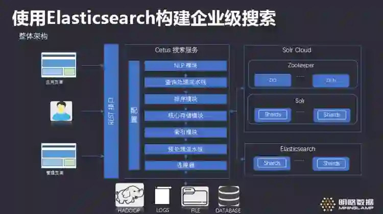 为了支持更多的业务场景,我们搭建了这样一套企业级搜索服务的整体架构:首先大家看右侧,是我们底层对接的搜索引擎,目前主要是 Elasticsearch,当然也正在接入 Solr Cloud。