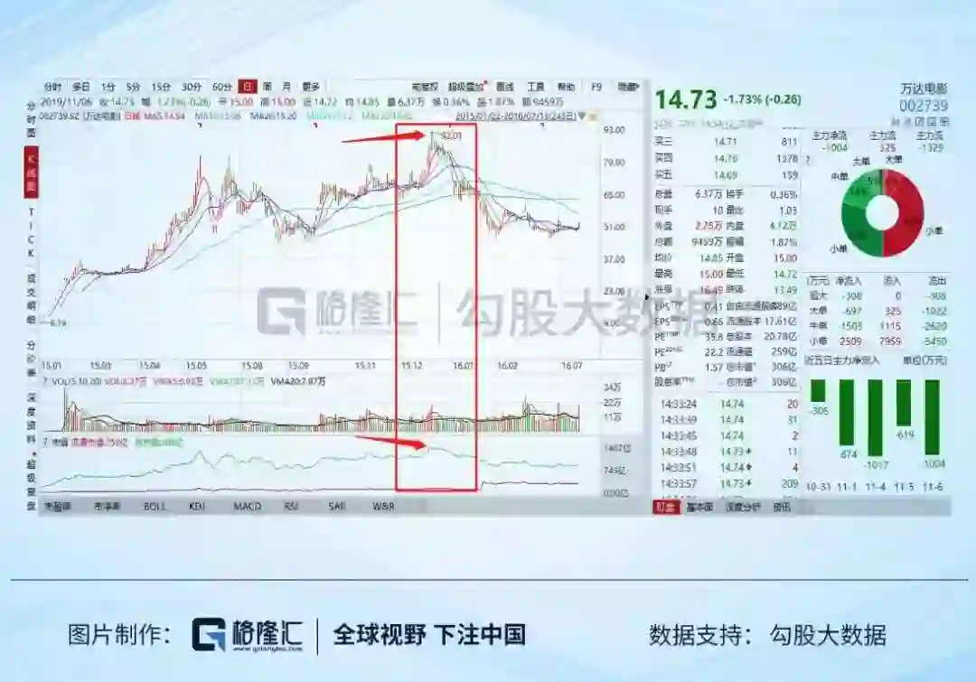 2015年1月20日,万达院线在深交所以上市。11个月后,2015年12月21日,万达院线股价达到92元,对应市值1467亿元。
