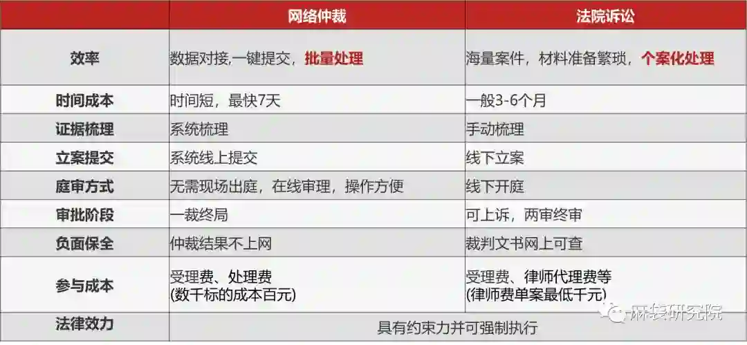 据上表可知,相对法院诉讼,新出现的网络仲裁在时间成本、人力成本等方面有压倒性优势。在保证同等法律效力的前提下,网络仲裁确实提供了一个更高效的路径去解决纠纷。