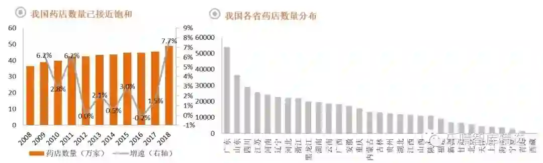 2010年后,药店数量逐渐饱和,增速从原来的5%以上的增速降到0-3%。从2015年开始,随着医药行业政策改革,对药品零售领域的监管逐渐趋严。