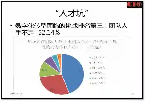 调研显示45%的企业IT团队都是20人以下,20多个人的团队基本上就在做内部的中介和采购。数字化不是说有了数字化的战略和规划,有了蓝图有了路线图就可以实现,其实真正的挑战是人。企业要考虑到底需要哪一类人以及怎样逐步的把数字化能力建立起来。