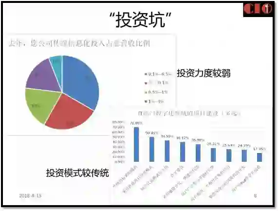 总体上投资力度比较弱,当然,企业根据自身情况决定数字化投资力度,这无可厚非,但是它必须跟战略和对数字化产出的期望保持一致。我们最怕数字化愿景很远大,目标很高,但数字化投资却非常保守,或者每次一谈到投资,决策人就以没看清楚数字化的业务价值为理由,暂缓数字化项目的开展。