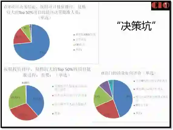 数据显示73%的项目是企业的最高领导来决策,董事长CEO或者总裁;69%是需要这个决策人参与专题的论证和会议讨论;而IT部门绩效44%需要决策人进行评价。所以: