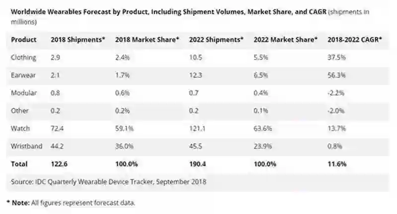 从IDC的预测中,也可以看出智能手表对智能手环的替代影响非常明显。此外,根据该预测,在未来几年中,我们还能看到智能服装、智能耳机设备在整个可穿戴市场中成为新的增长点。