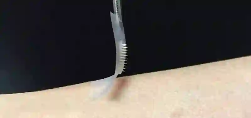 这种贴片覆盖有一百多个微针,里面包含着胰岛素和葡萄糖传感酶存储单元。贴在皮肤上后,微针会穿透皮肤表面,当体内血糖水平太高时,会快速释放药物,通过毛细血管进入血液。