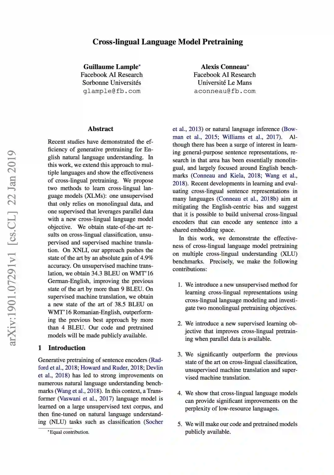 最近的研究已经表明使用预训练的语言模型,对提高英语自然语言理解的能力有很大帮助。在这项工作中,我们将这种方法扩展到多种语言,并展示了跨语言预训练模型的有效性。我们提出了两种学习跨语言模型的方法:一种是只依赖单语数据的无监督方法,另一种是利用具有新的跨语言模型目标的并行数据的监督方法。我们在跨语言分类、无监督和有监督机器翻译方面取得了最先进的成果。实验结果显示XML在XNLI任务上比原来的state-of-the-art直接高了4.9个百分点;在无监督机器翻译WMT’16 German-English中,比原来的state-of-the-art高了9个BLEU;在有监督的机器翻译WMT’16 Romanian-English中,比原来的state-of-the-art高了4个BLEU;我们的代码和经过训练的模型将公开提供。