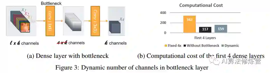 2、这里1×1卷积的作用是固定输出通道数,达到降维的作用。当几十个Bottleneck相连接时,Concatnate后的通道数会增加到上千,如果不增加1×1的卷积来降维,后续3×3卷积所需的参数量会急剧增加。1×1卷积的通道数通常是GrowthRate的4倍。