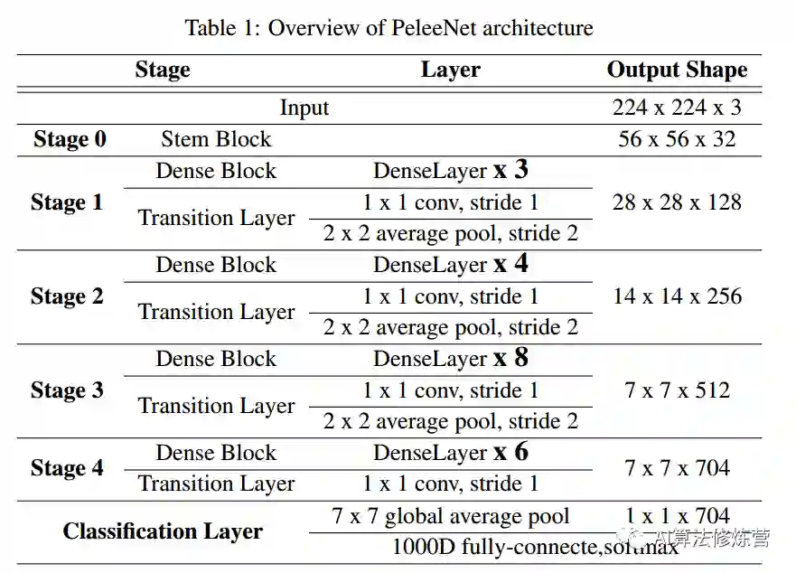 PeleeNet实际上是DenseNet的变体,使用的依然是DenseNet的连接方法,核心的设计原则也和DenseNet相仿(特征重用)。PeleeNet的主要结构: