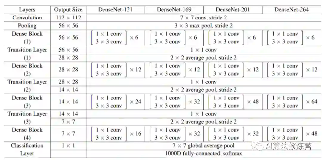 1、DenseNet-121由121层权重层组成(其中4个Dense block,共计2×(6+12+24+16) = 116层权重,加上初始输入的1卷积层+3过渡层+最后输出的全连接层,共计121层);