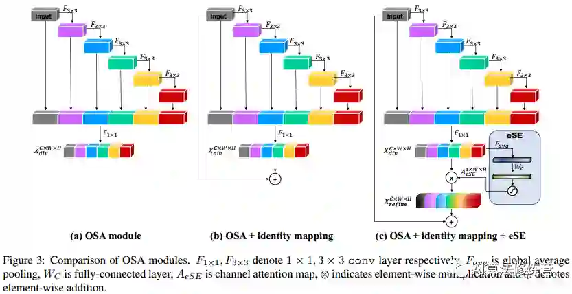 OSA只在最后一次性聚合前面所有的layer。这一改动将会解决DenseNet的问题,因为每个layer的输入channel数是固定的,这里可以让输出channel数和输入一致而取得最小的MAC,而且也不再需要1x1卷积层来压缩特征,所以OSA模块是GPU计算高效的。